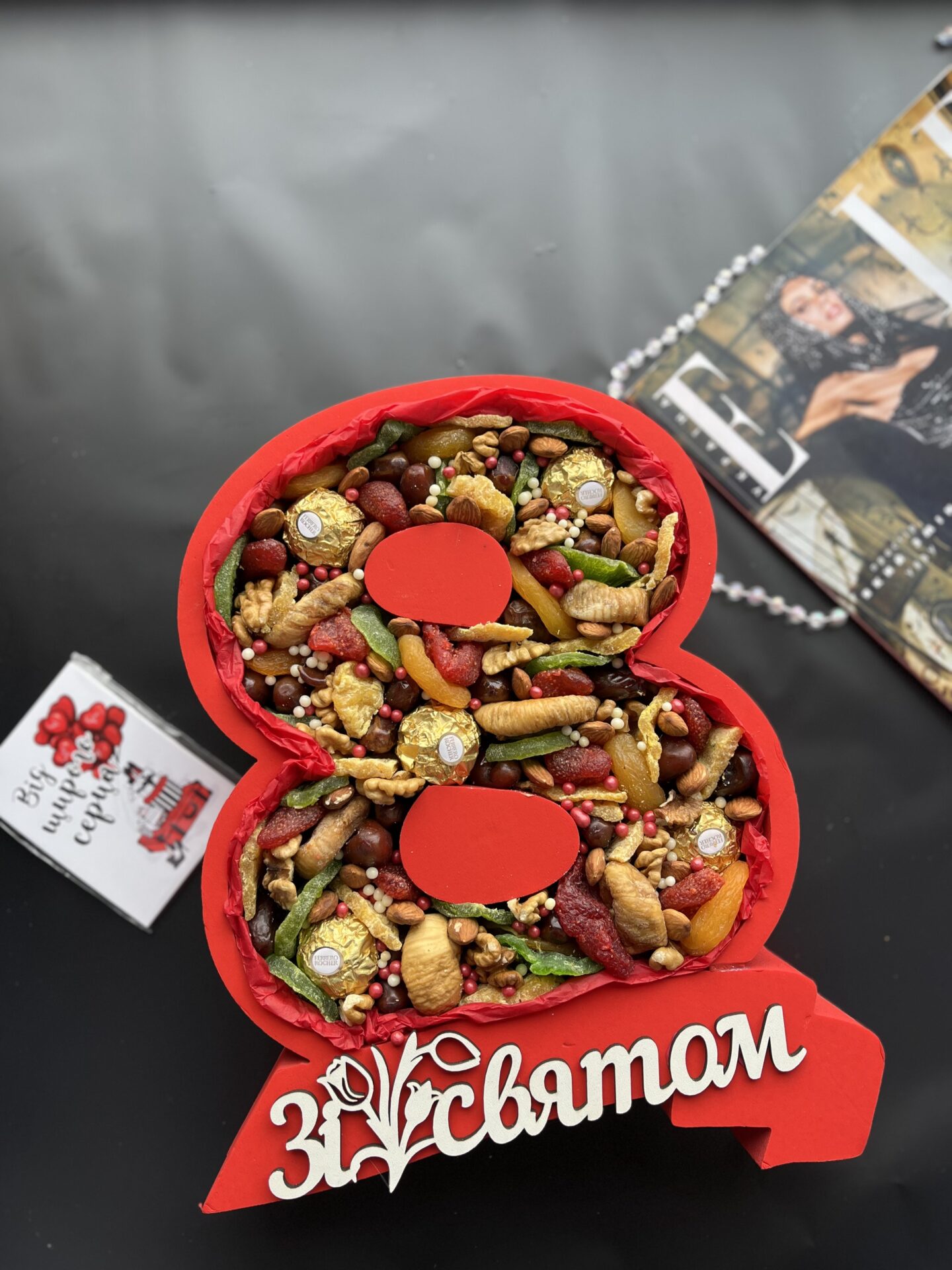 Напис Українською мовою, проте можна обирати .Дизайн букету та зазначені інгрідієнти можуть змінюватись в залежності від сезону та ваших особистих вподобань. В разі відсутності деяких складових, вони можуть бути замінені на інші. Полуниця в бельгійському шоколаді ручної роботи. Клубника в шоколаде.