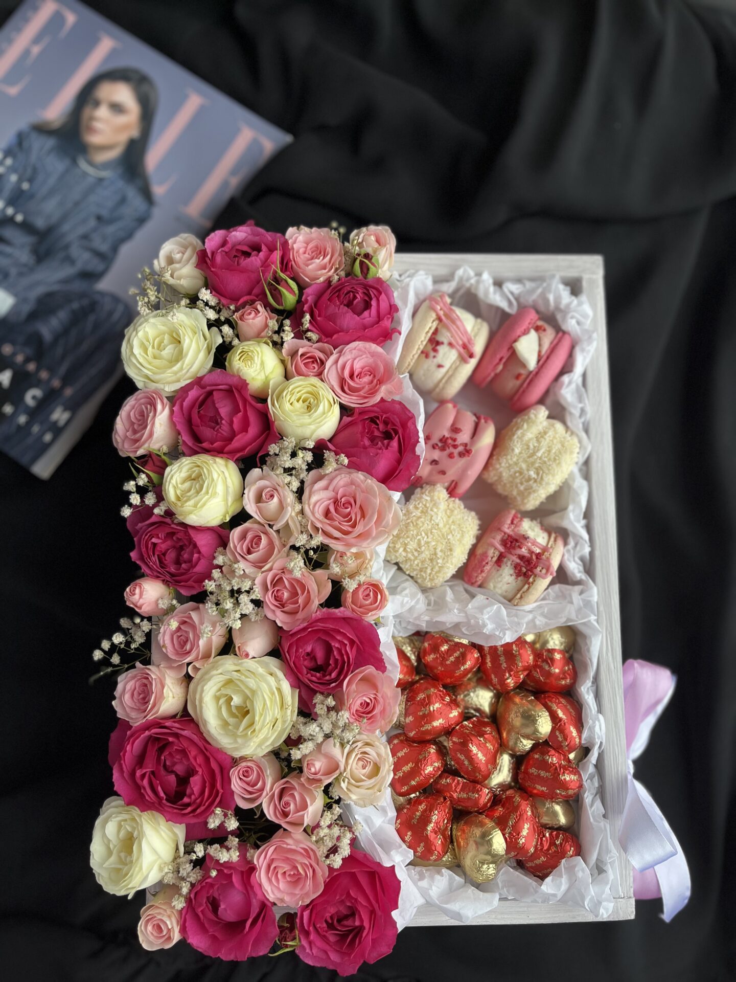 • Флористичне наповнення: Ліва частина боксу заповнена щільною композицією з троянд різних відтінків (білі, світло-рожеві, яскраво-рожеві та малинові).
