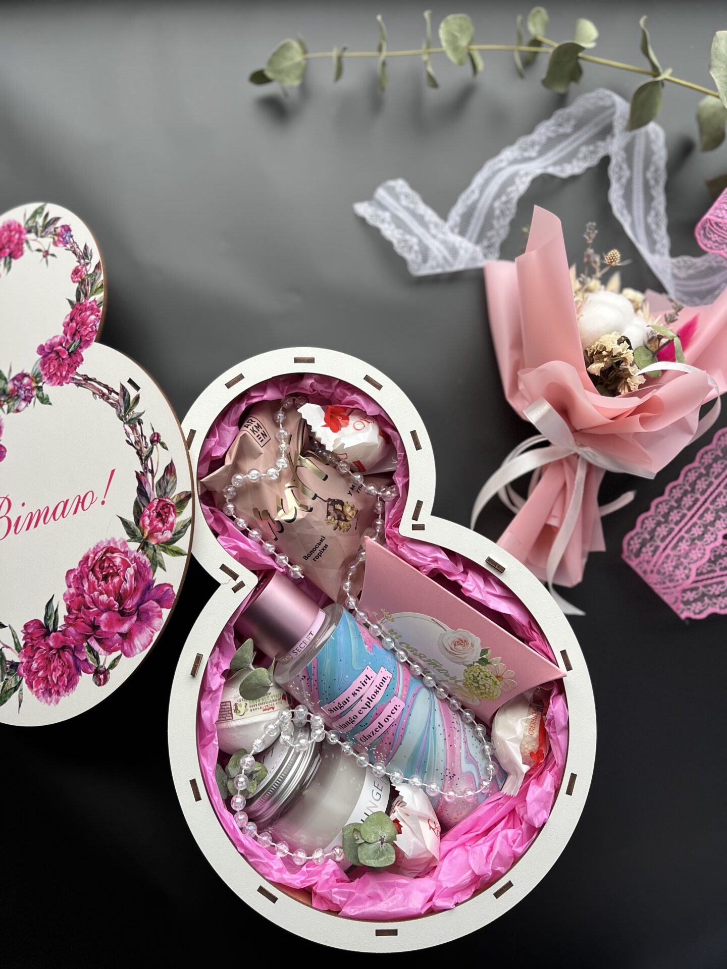 - Пакування: Дерев’яна коробка у формі цифри 8 з декоративною кришкою, прикрашеною квітковим принтом (півоніями). Внутрішня частина вистелена яскраво-рожевим папером-наповнювачем.